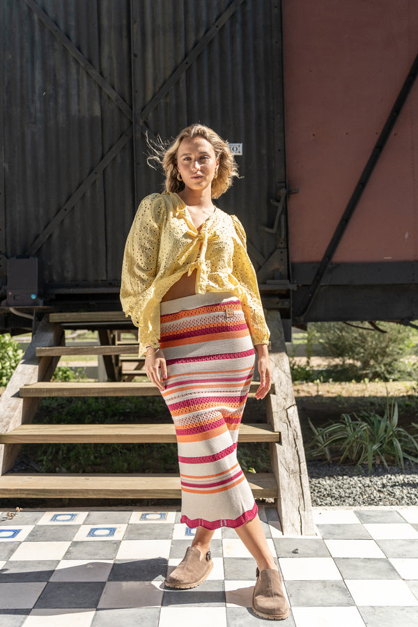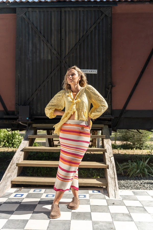 Una prenda con textura, color y carácter. Esta pollera tejida combina diferentes tonos en un diseño original. Es cómoda, liviana y fácil de usar, perfecta para sumar un toque especial a cualquier outfit sin complicaciones.